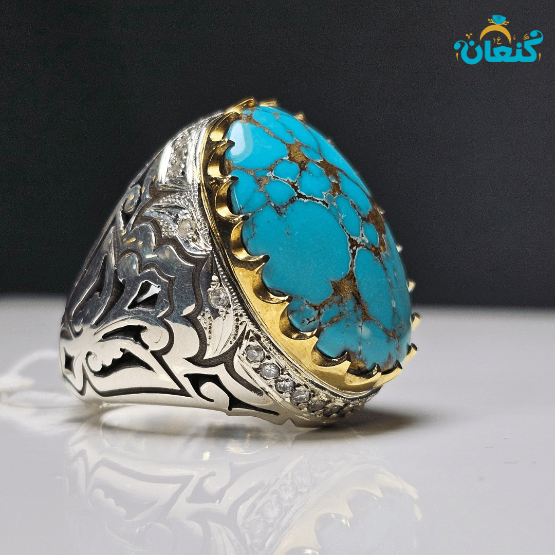 در قلب این انگشتر، فیروزه اصل شجری نوع عنکبوتی گل کاسنی نیشابوری با رنگ آسمانی و نقشهای طبیعی قرار گرفته است — سنگی با عمقی بی‌پایان که تنها در بهترین معادن نیشابور یافت می‌شود.