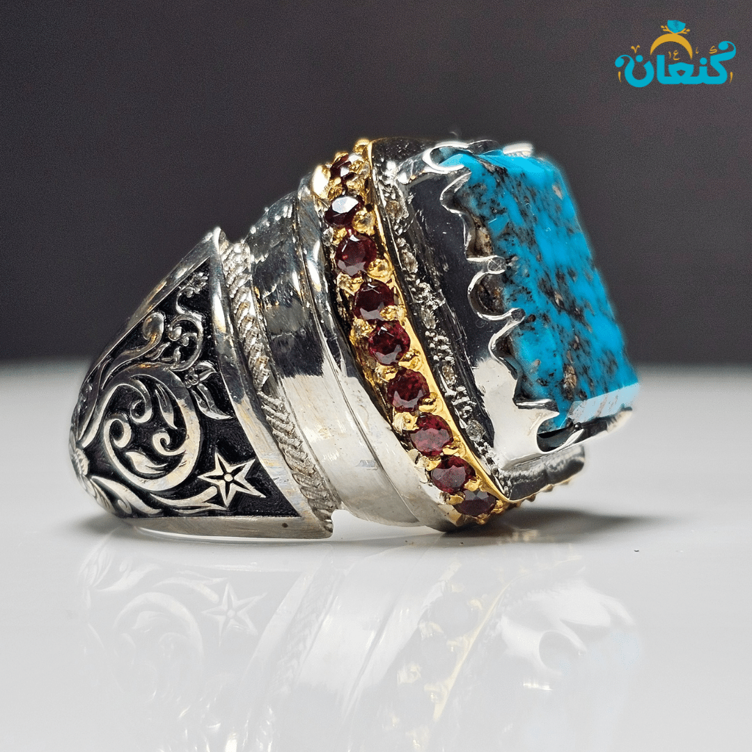 در قلب این اثر، فیروزه چهارگوش آبی محک اصل نیشابوری قرار دارد — سنگی با رنگی عمیق، شفافیت بالا و کیفیت بینظیر که تنها در بهترین معادن نیشابور یافت میشود. برش چهارگوش دقیق آن، نشانهای از سلیقهی بالا و دقت در اجراست.