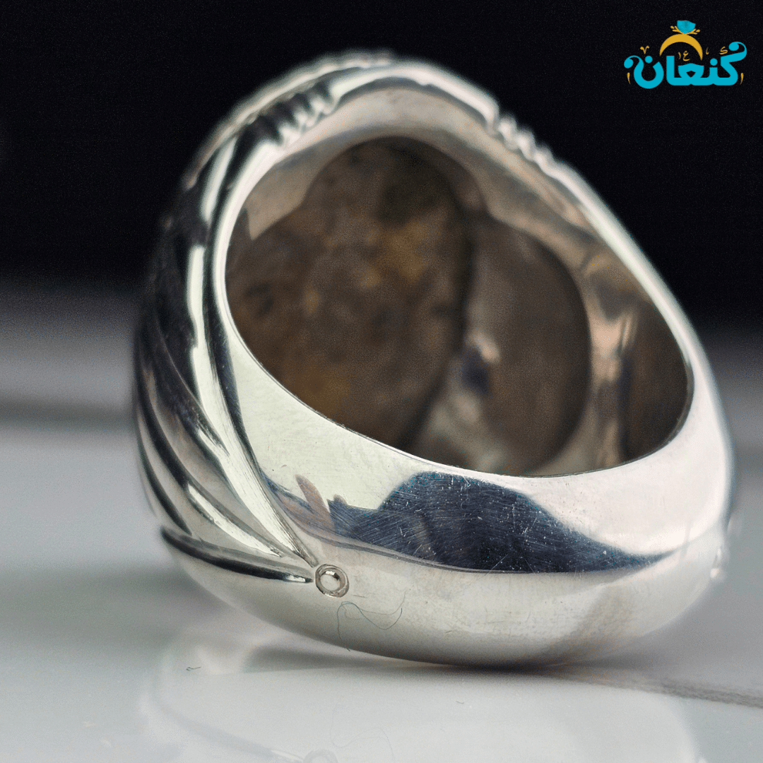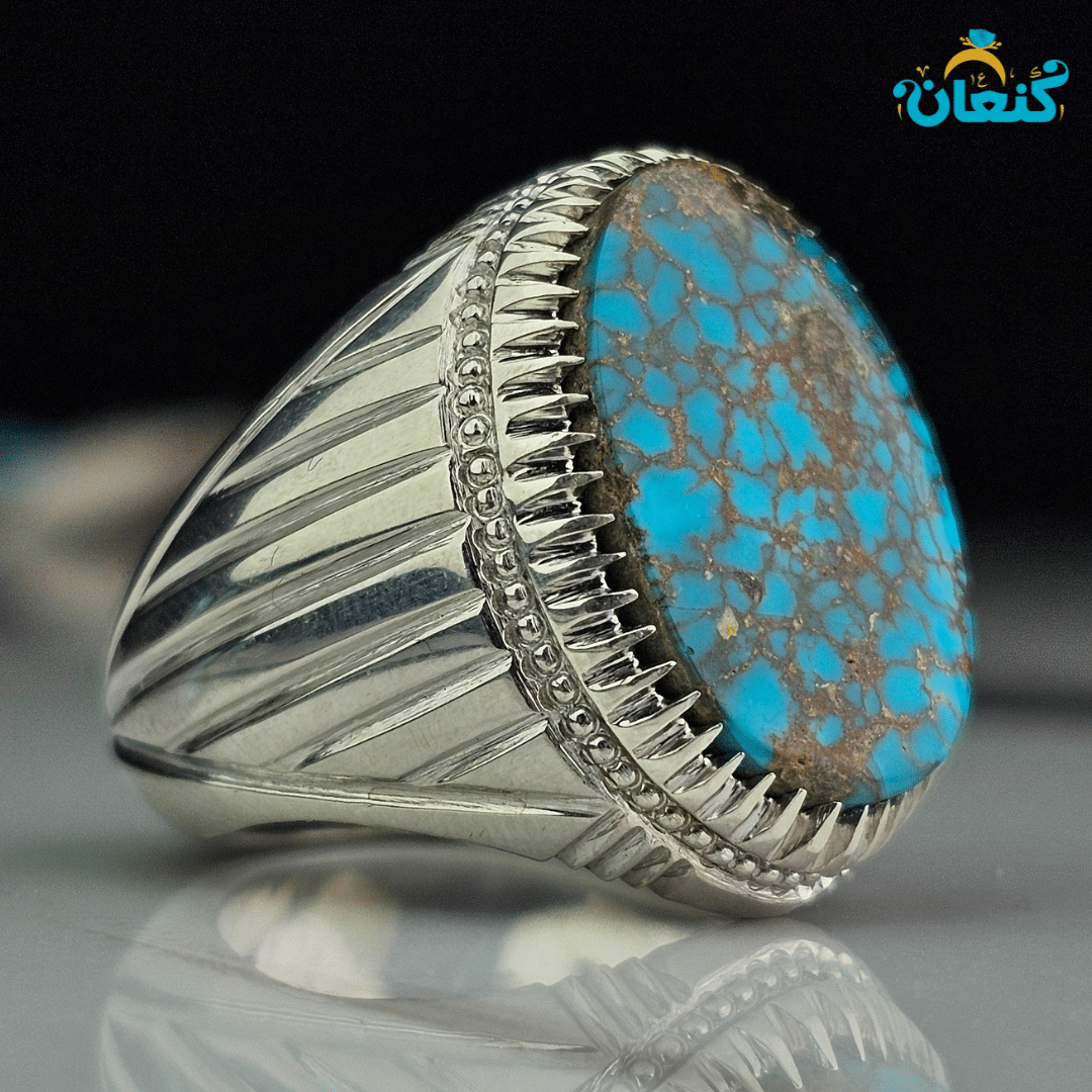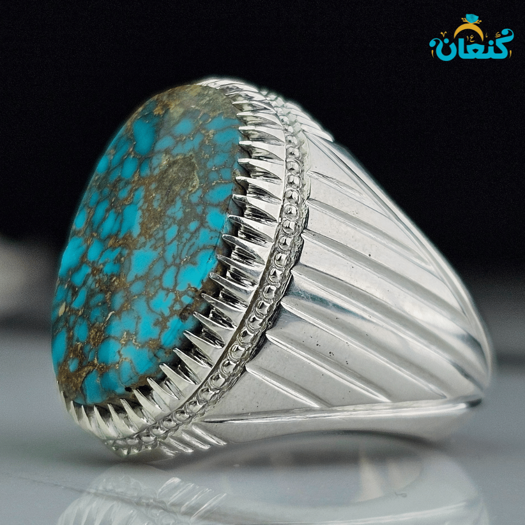 در قلب این شاهکار، فیروزه اصل شجری نوع عنکبوتی با رگههای طلایی طبیعی نیشابوری قرار گرفته است — سنگی با نقشهای شببستری شبکهای (عنکبوتی)، رنگ آسمانی عمیق و رگههای طلایی طبیعی که تنها در بهترین معادن نیشابور یافت میشود.