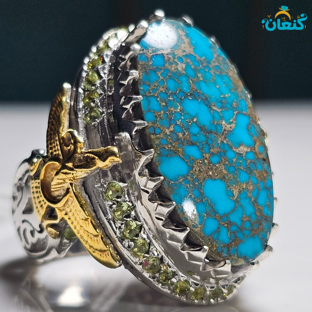 - سنگ مرکزی: فیروزه اصل شجری رگه طلایی عنکبوتی نیشابوری (طبیعی)