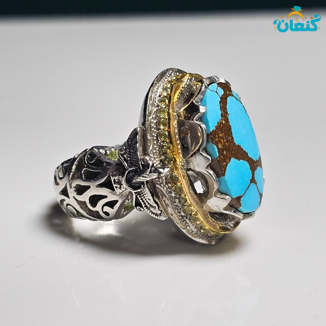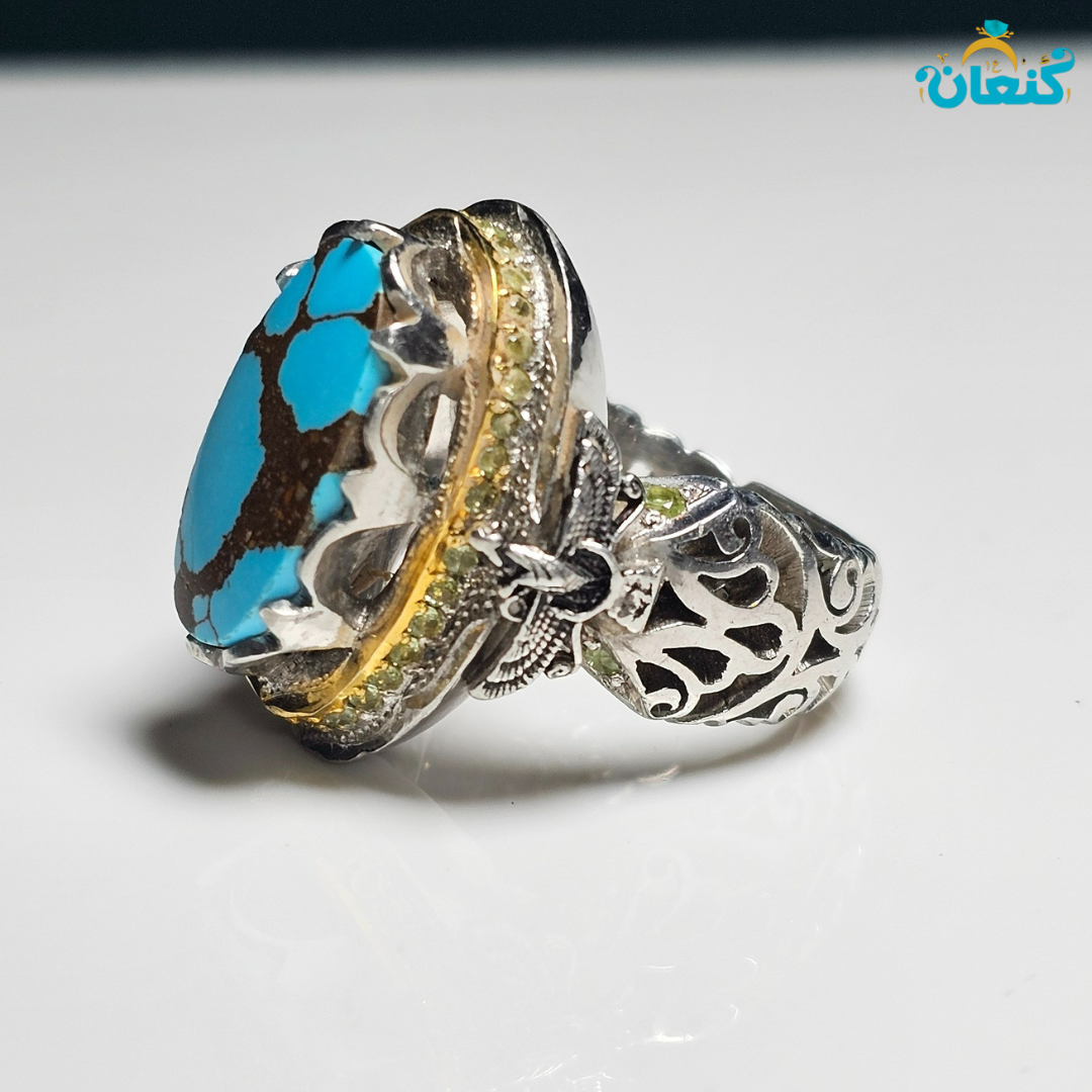 در قلب این شاهکار، فیروزه اصل نیشابوری قرار گرفته است — سنگی با رنگ آسمانی عمیق و بدون ناخالصی که تنها در بهترین معادن نیشابور یافت میشود.