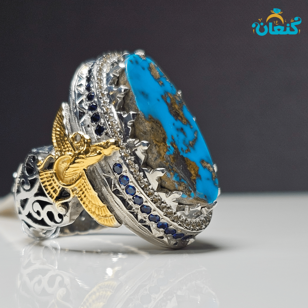 در قلب این نگین، فیروزه آبی محک با رگه‌های طلایی طبیعی قرار گرفته است — سنگی با عمقی بی‌پایان و درخششی خورشیدی که زیبایی آن تنها با دیدن قابل توصیف نیست.