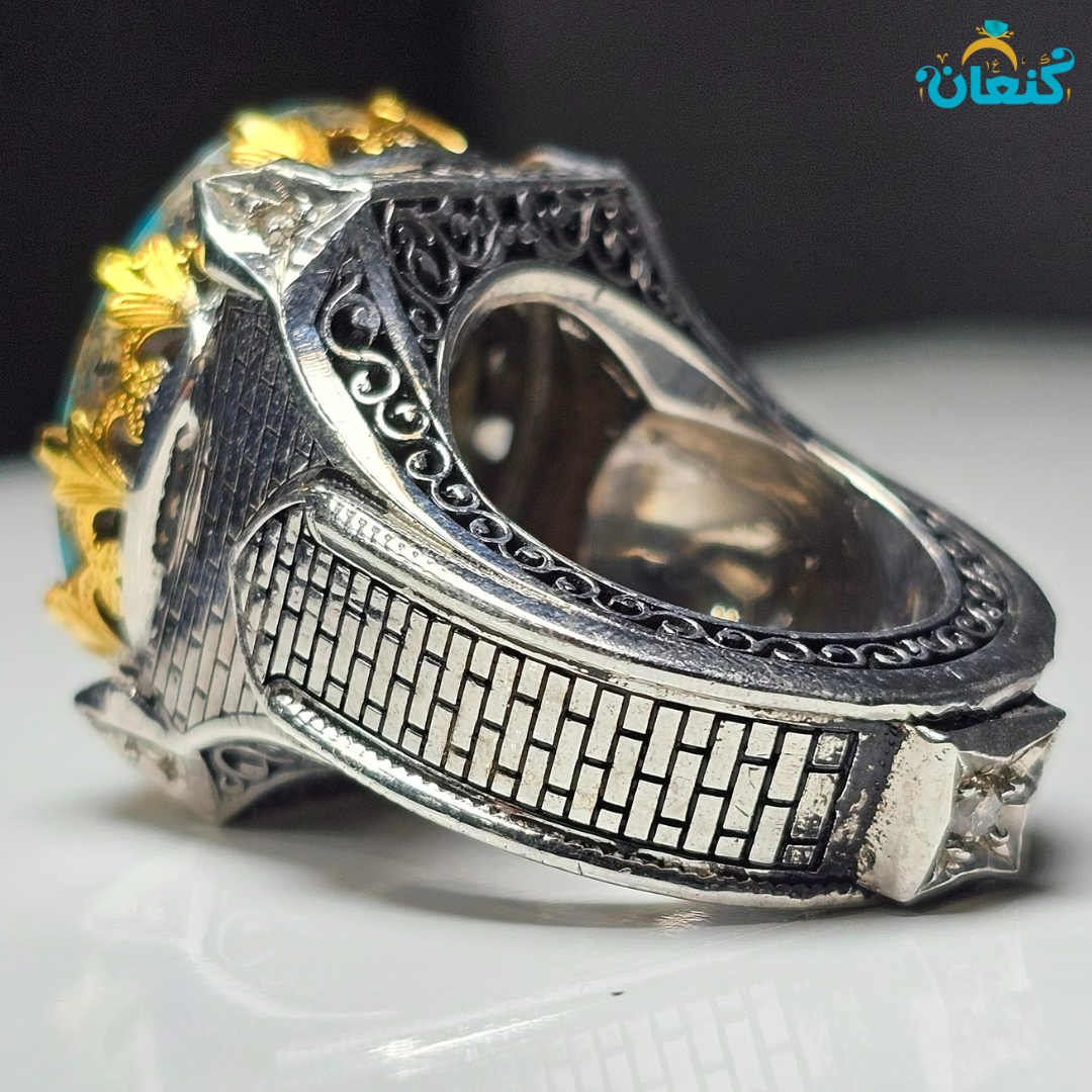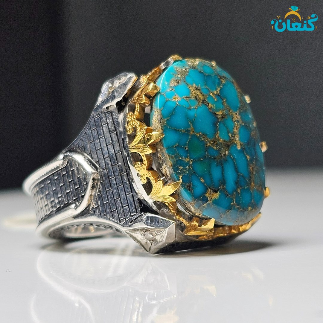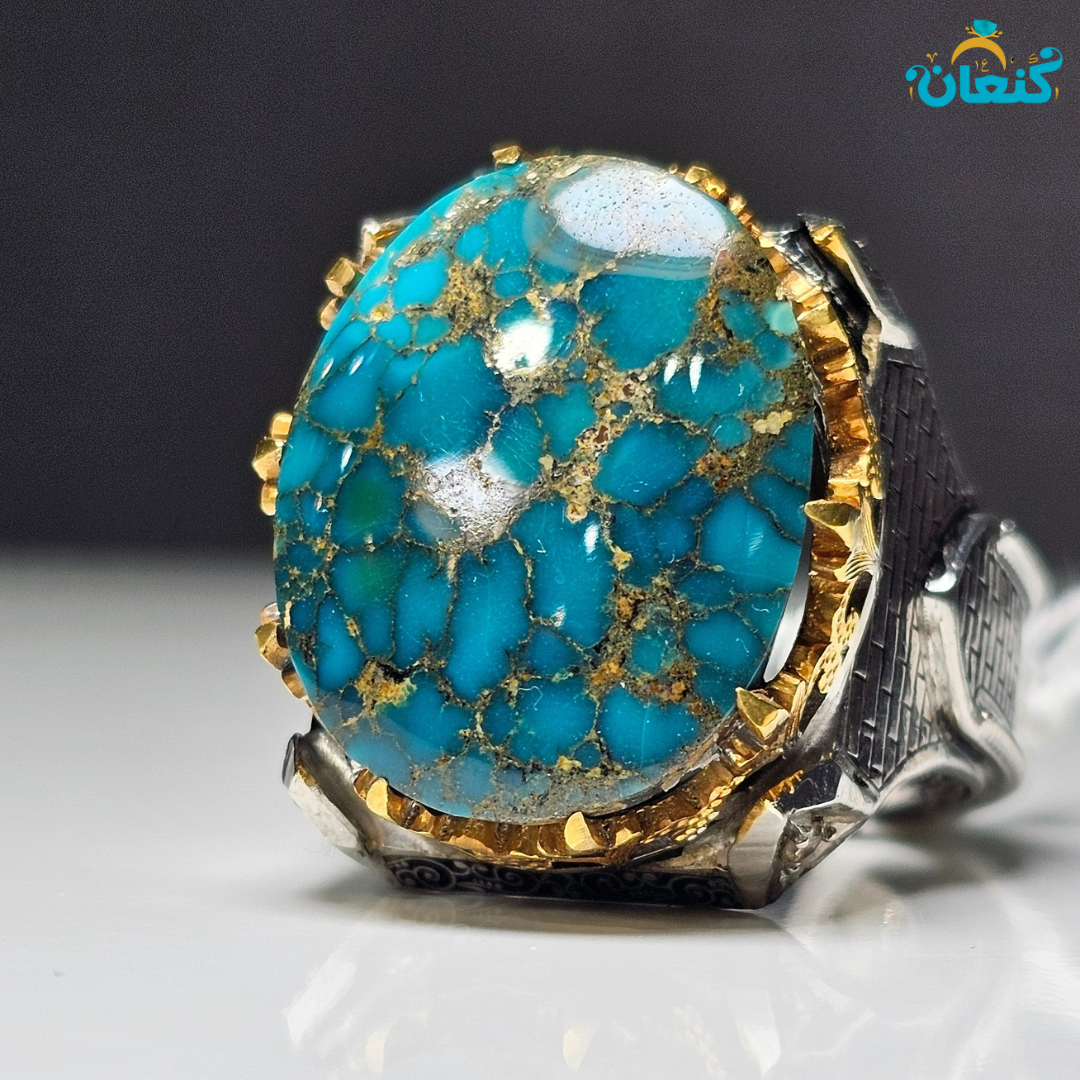 • سنگ مرکزی: فیروزه اصل شجری عنکبوتی رگه طلایی نیشابوری (طبیعی)