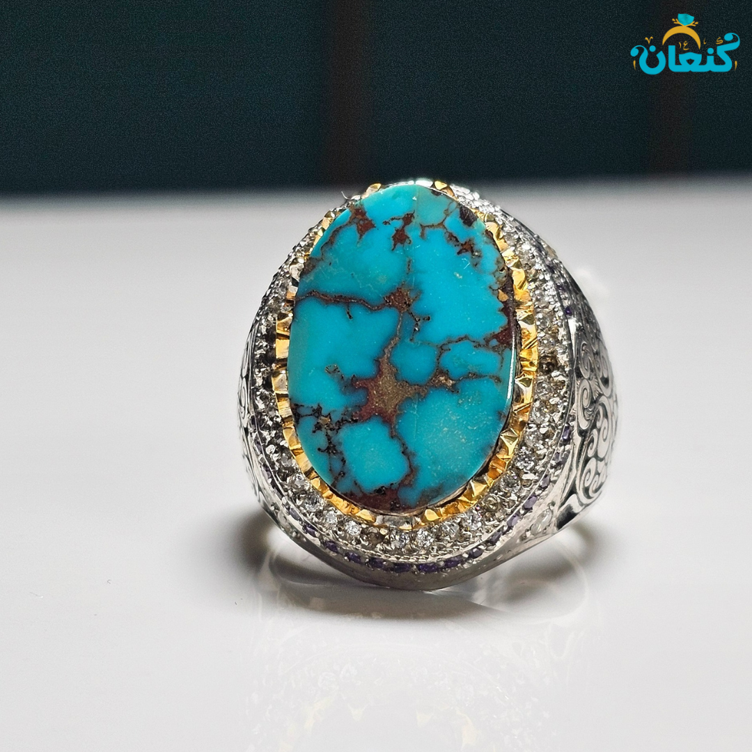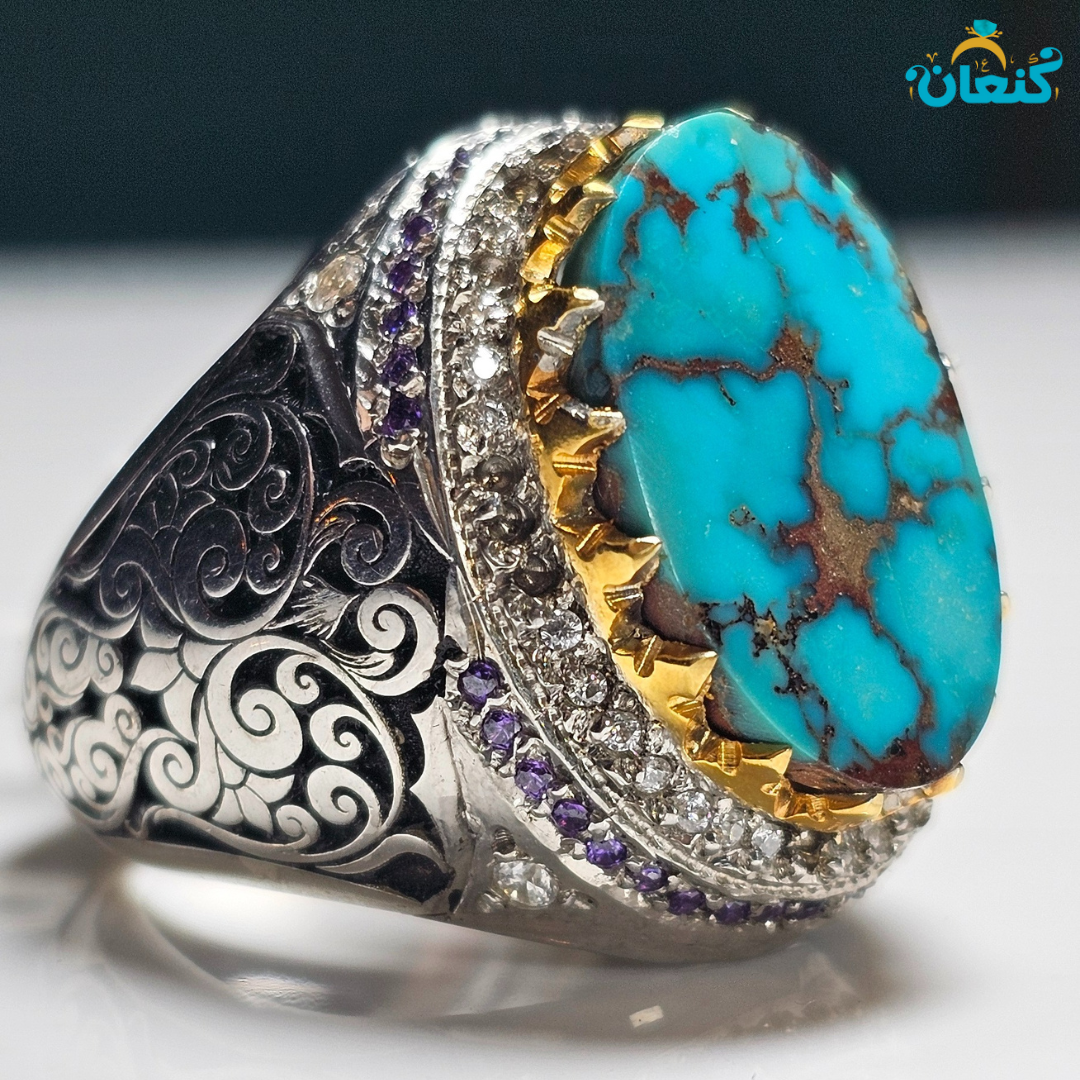 در قلب این شاهکار، فیروزه اصل شجری نوع گل کاسنی نیشابوری قرار گرفته است — سنگی با رنگ آسمانی عمیق، شفافیت بالا و بدون ناخالصی که تنها در بهترین معادن نیشابور یافت میشود.