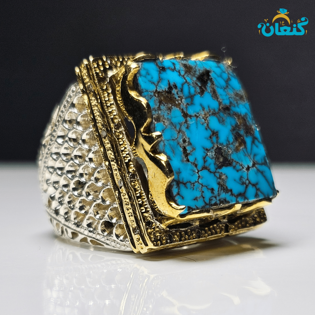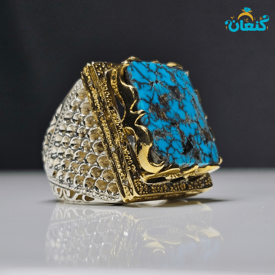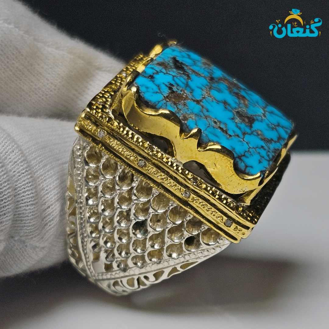 در قلب این اثر، فیروزه اصل شجری نوع عنکبوتی نیشابوری با رنگ آسمانی و نقشهای طبیعی قرار گرفته است، همراه با سنگ سیاه اصل که ترکیبی مرموز، عمیق و جذاب با فیروزه ایجاد کرده است. این تقابل سفید و سیاه، نمادی از تعادل، یواشی و قوت است.