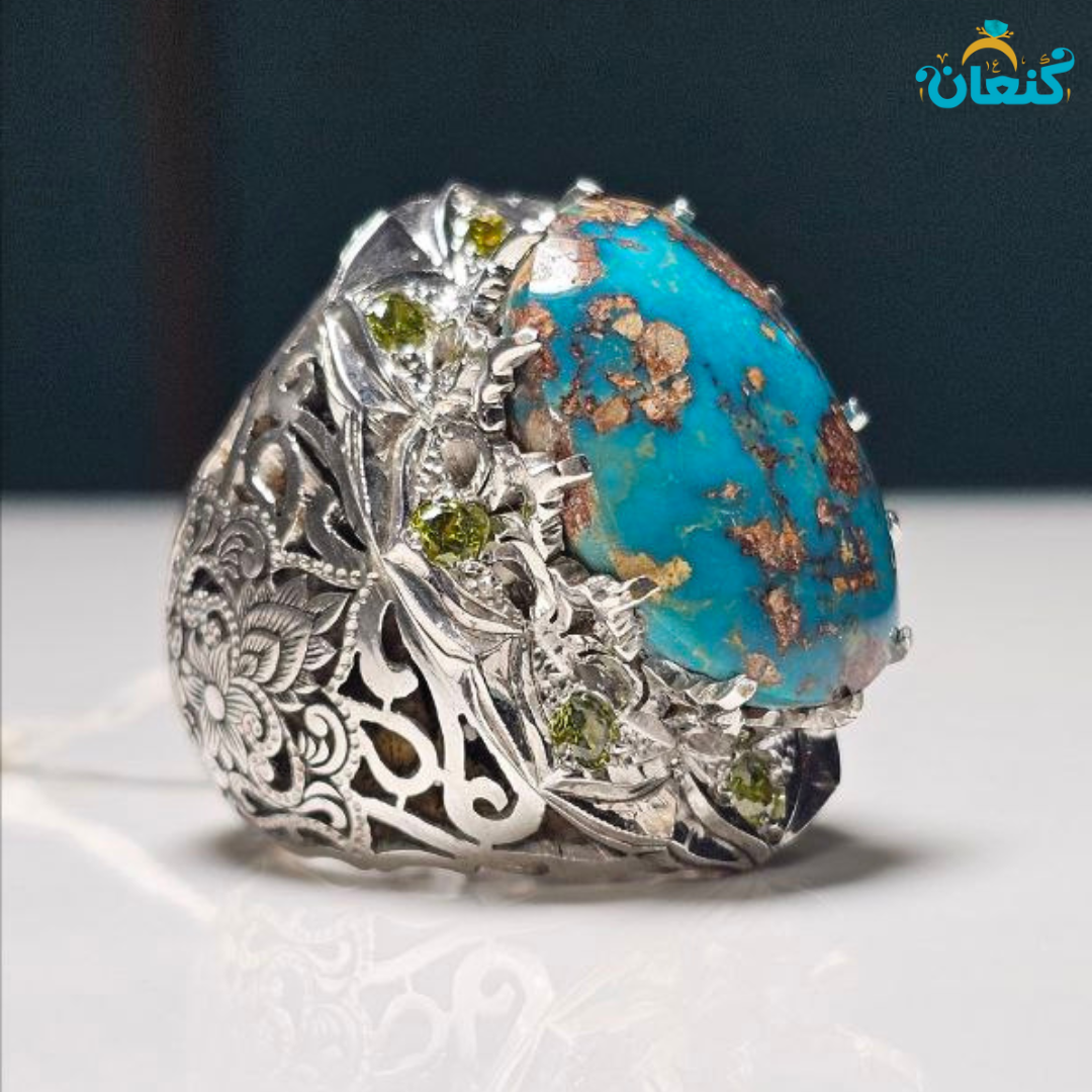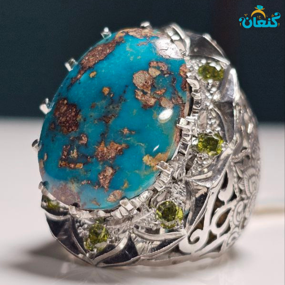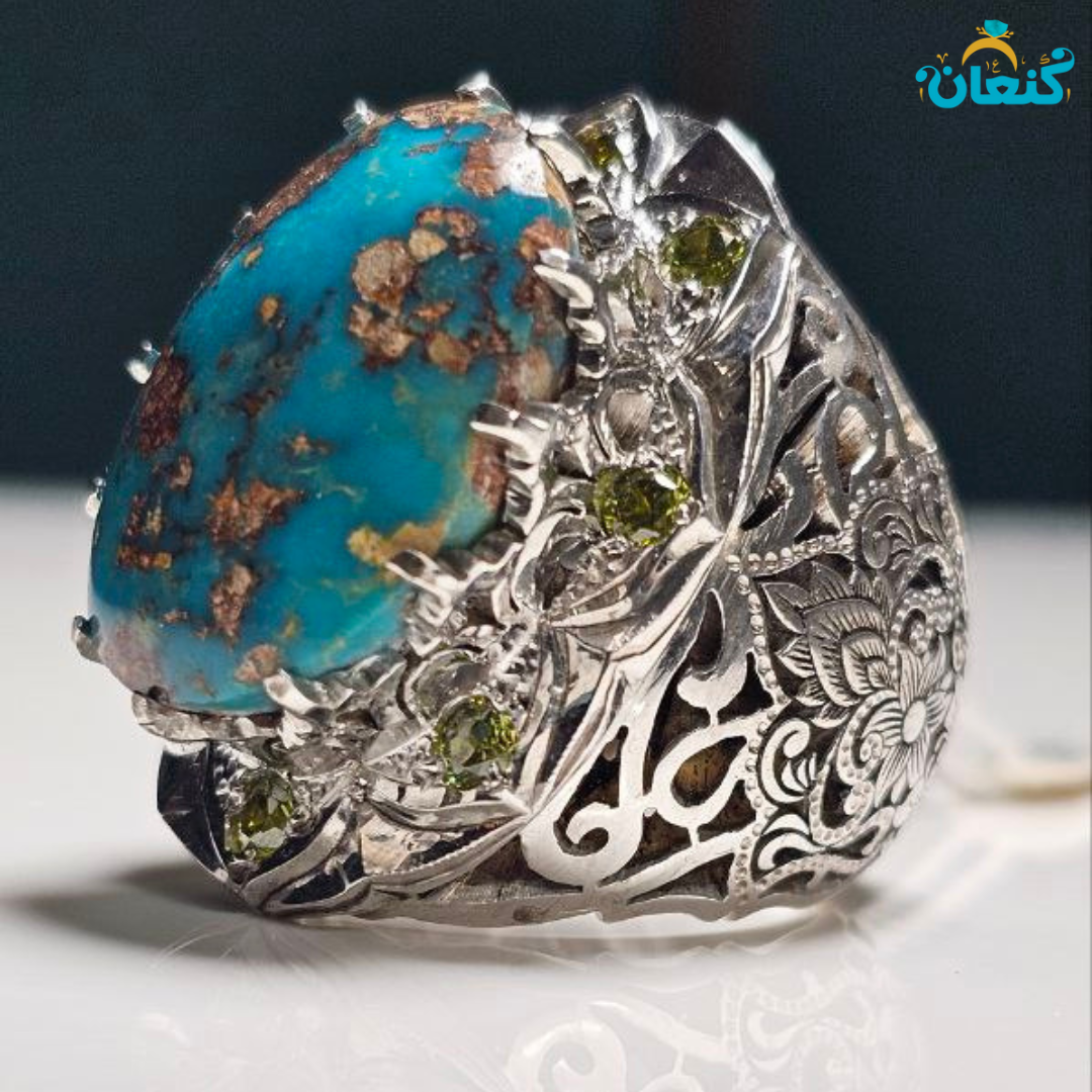 در قلب این شاهکار، فیروزه اصل شجری نوع سبز رگه طلایی نیشابوری قرار گرفته است — سنگی با: