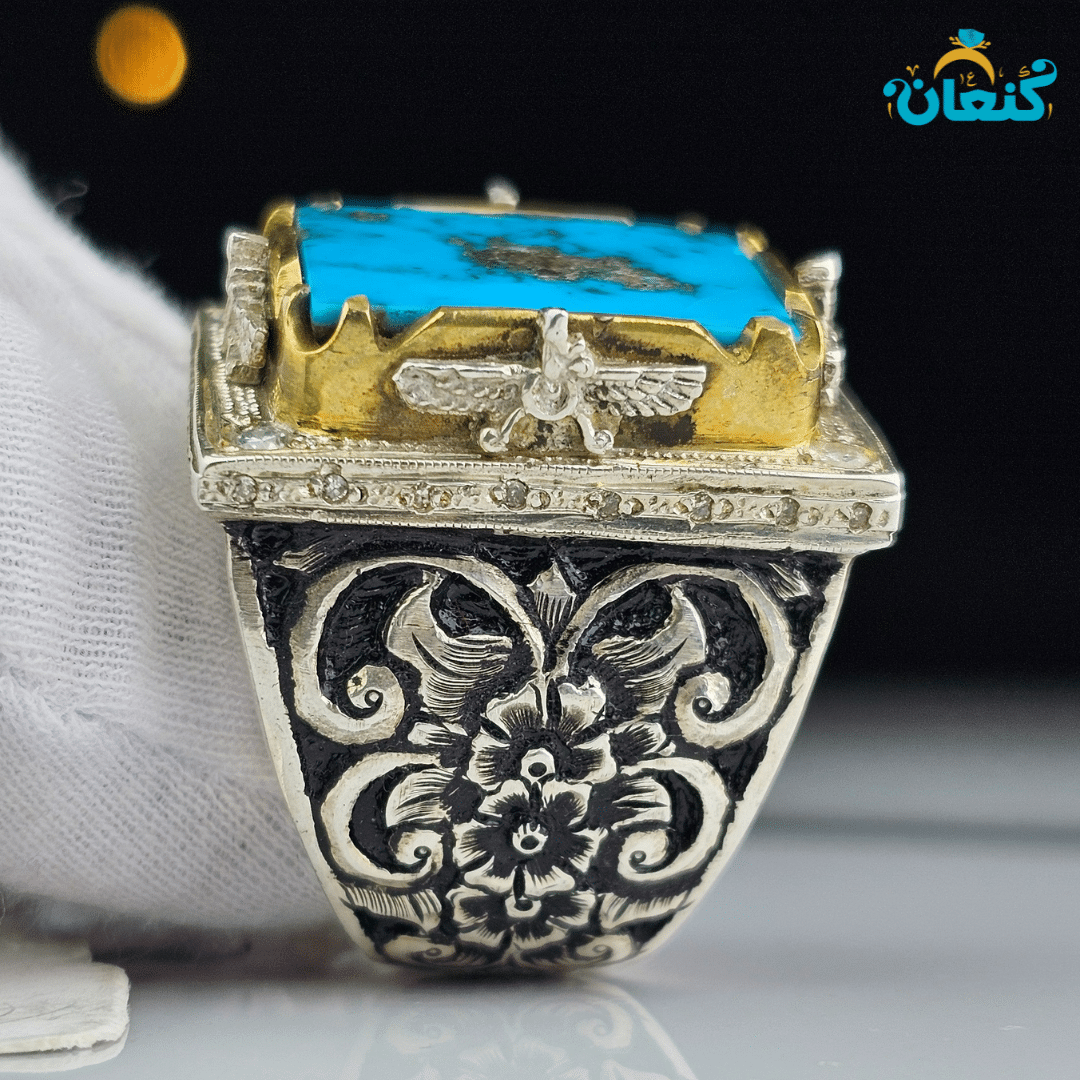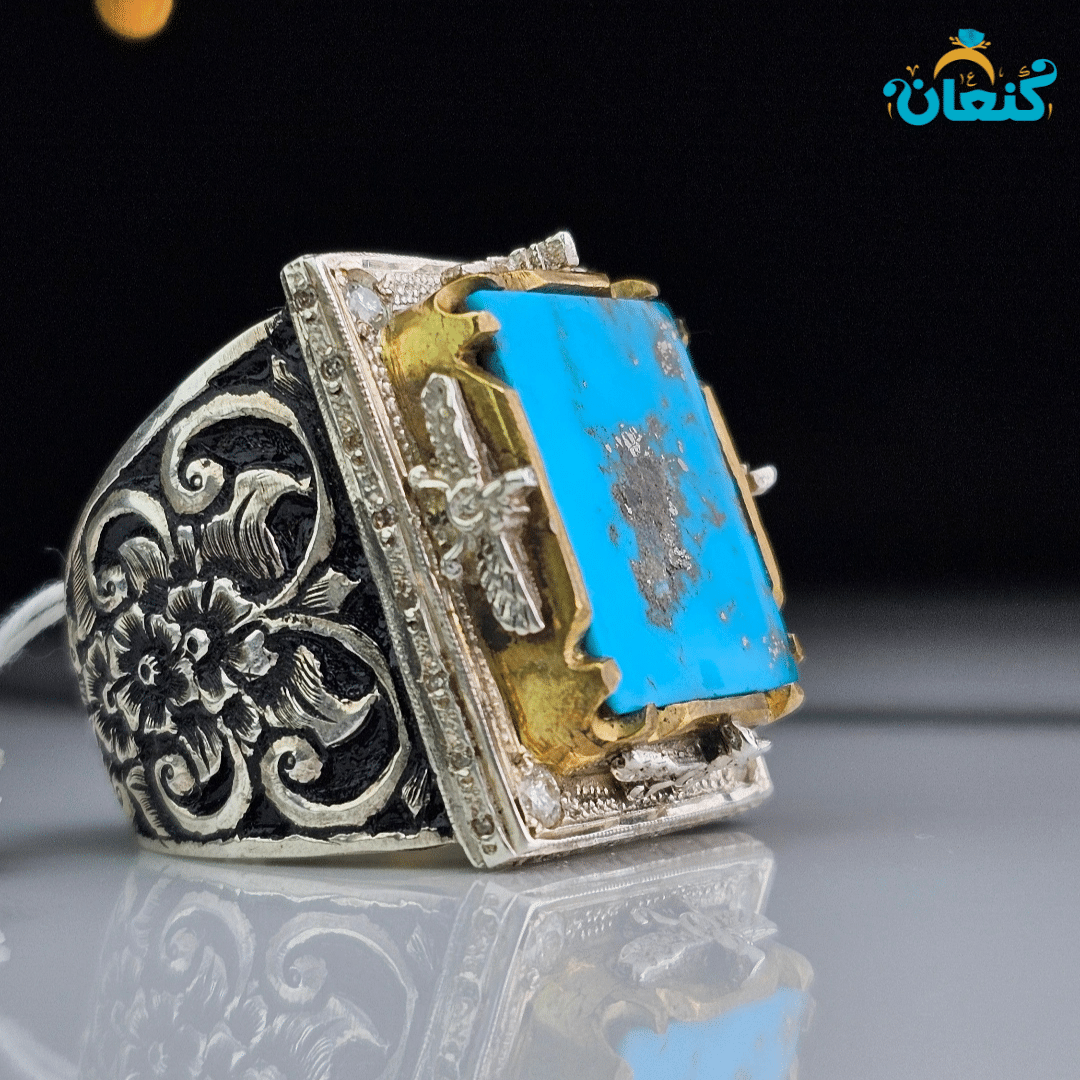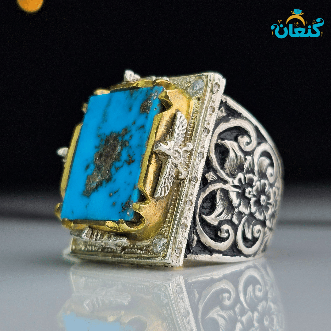 در قلب این شاهکار، فیروزه اصل شجری نوع آبی محک کاملاً طبیعی نیشابوری قرار گرفته است — سنگی با رنگی عمیق، شفافیت بالا و نقشهای طبیعی که تنها در بهترین معادن نیشابور یافت می‌شود. این فیروزه، نفسی از آسمان ایران را در خود دارد.