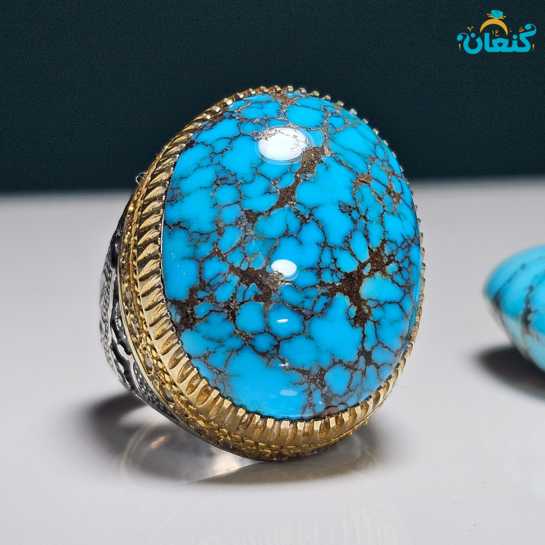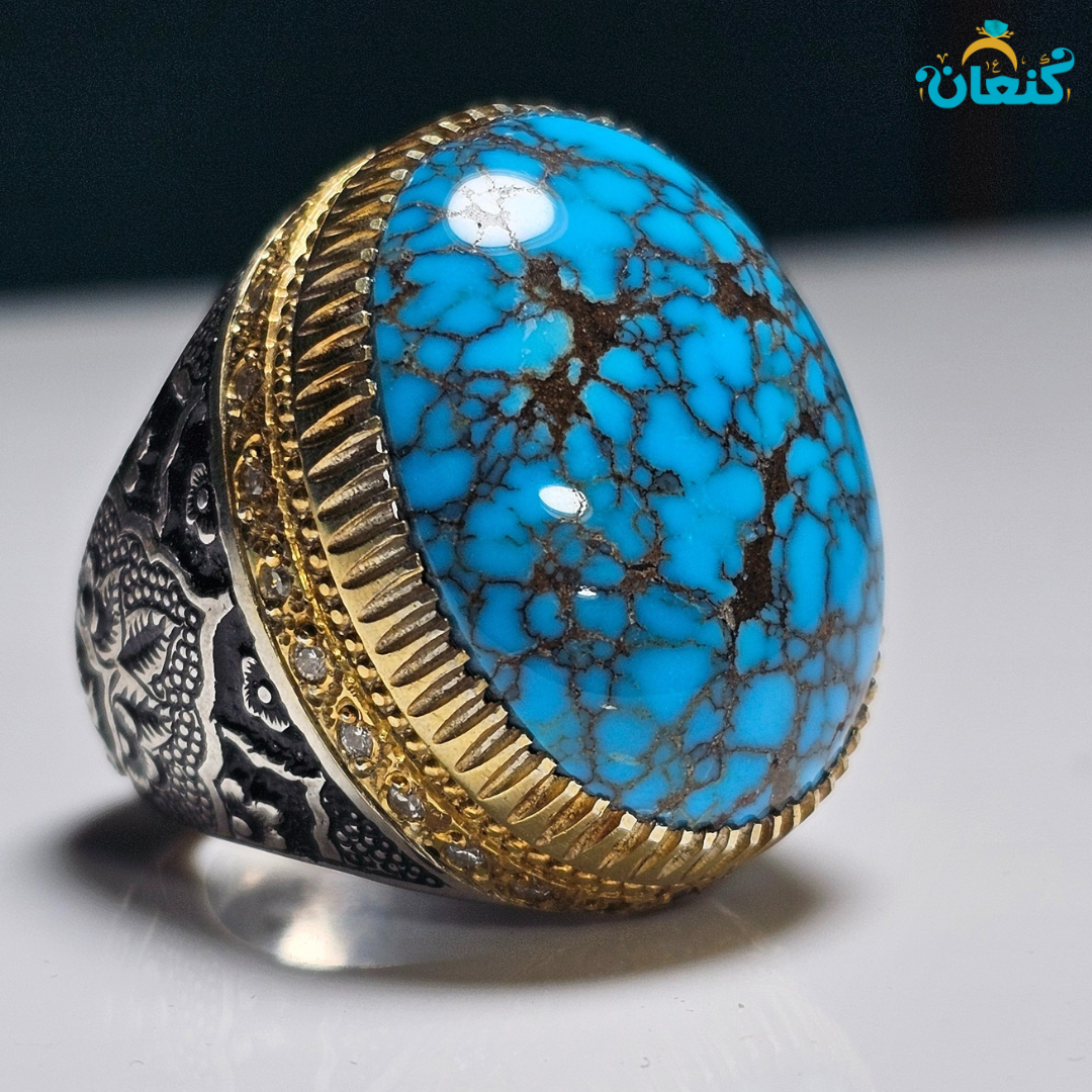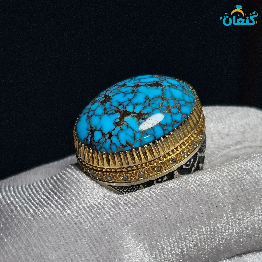 در قلب این شاهکار بیهمتا، فیروزه اصل شجری نوع عنکبوتی سنگ سیاه خوش نقش کمنظیر نیشابوری قرار گرفته است — سنگی با: